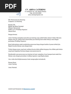 Catering sehati alamat kompleks bpd jatiwuru no. Surat penawaran merupakan surat ajakan kerjasama bisnis yang berisi mengenai suatu penawaran produk barang ataupun jasa yang ditujukan kepada perorangan maupun kepada instansi perusahaan. Tak memandang usia, banyak dari mereka yang masih berusia remaja bahkan yang sudah tua juga menggeluti profesi. Contoh surat penawaran barang dan jasa dan tips pembuatannya. Sebab, negosiasi awal dilakukan melalui surat penawaran. Cara membuat surat penawaran dengan benar. Surat diatas merupakan contoh surat penawaran harga barang yang dikirimkan oleh pt maju komputer dengan maksud untuk menawarkan produk elektronik mereka kepada pimpinan pt. Jenis surat ini tergolong masih merupakan salah satu jenis surat. Surat penawaran sendiri adalah surat yang dibuat dengan tujuan untuk menawarkan sesuatu, baik barang. Pasalnya, inti dari surat ini adalah memperkenalkan produk anda kepada pihak lain yang berpotensi membelinya. Contoh surat penawaran untuk jasa. Contoh surat penawaran produk kue. Kepada yth bapak/ibu manajer operasional reinkarnation wedding organizer jl.