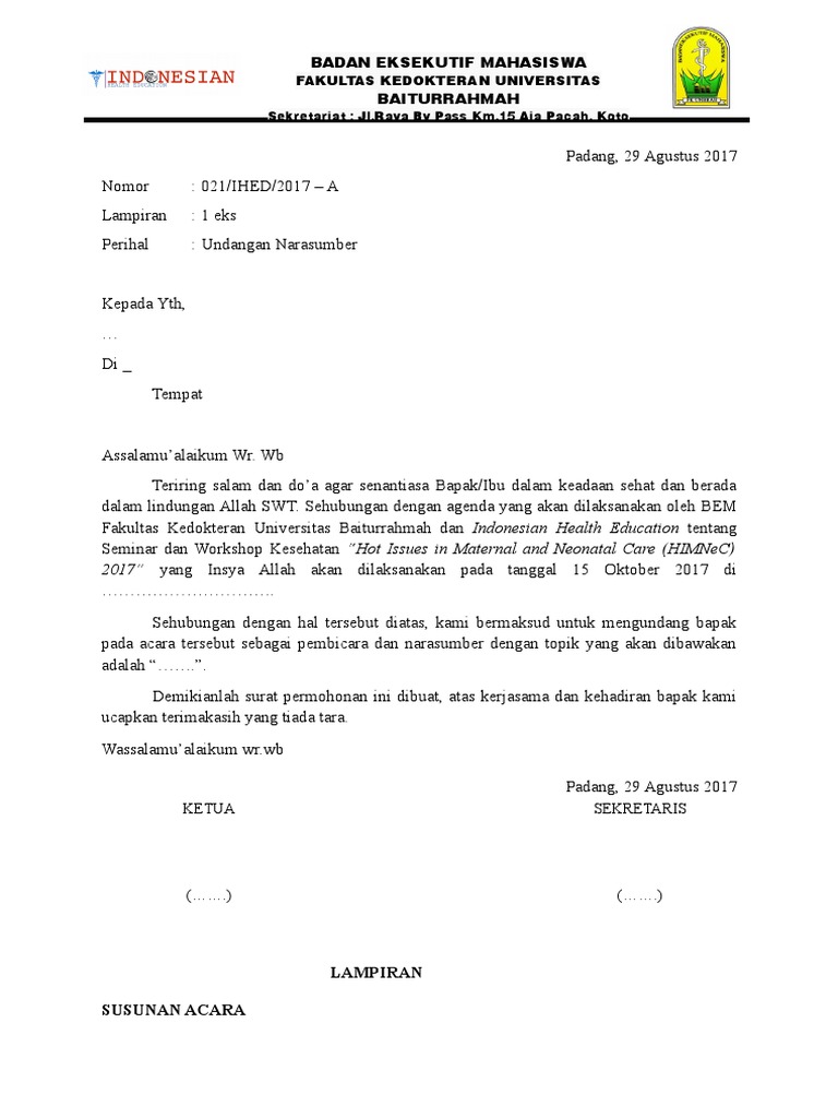 Surat Permohonan Pembicara Ilmusosial Id from www.made-blog.com Contoh surat undangan resmi sangat banyak, namun pada umumnya memiliki tujuan yang sama, yakni mengundang pihak lain untuk menghadiri sebuah kegiatan. Surat peminjaman tempat merupakan surat yang dibuat untuk memberitahukan maksud atau keinginan anda bahwa anda ingin meminjam tempat tersebut yang akan anda gunakan untuk melakukan berbagai kegiatan yang tentunya harus anda cantumkan secara jelas di dalam isi surat. Contoh surat undangan sosialisasi kesehatan. Surat undangan seminar juga bisa dikategorikan sebagai contoh undangan formal dalam bahasa inggris beserta artinya yang digunakan oleh kelompok tertentu. Jika anda bekerja di bagian administrasi kegiatan surat menyurat adalah hal yang biasa karena itulah, kami memberikan beberapa contoh format undangan resmi yang bisa digunakan untuk beberapa acara, misalkan pengajian, rapat, seminar, atau yang lainnya. Jangan khawatir, kamu bisa cari tahu struktur dan contoh surat dinas di sini, kok. Ketua prodi diharapkan menghadiri dan memberikan sambutan pada kegiatan tersebut. Jakarta , 2 desember 2017.