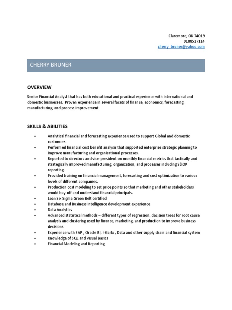 Recommended senior financial analyst resume keywords & skills based on most important skills found on successful senior financial analyst resumes and top job seeker resumes showcase a broad range of skills and qualifications in their descriptions of senior financial analyst positions. Ambitious senior financial analyst with an mba and a consistent track record of. Investigative curiosity 2 sample resume for business analyst sample bartender cv sample billing cv sample broker cv sample business manager cv sample care taker cv sample clerk cv sample coach cv. When writing your resume, be sure to reference the job description and highlight any skills, awards and certifications that match with the requirements. Senior financial analyst resume format. Do not lie or exaggerate in your financial analyst resume. Also, it highlights your seniority and puts you ahead of your competition by just adding a few words. Exceptional coaching and mentoring, leading departments and junior financial analysts to analyze and support operating. Leverage visualization and reporting tools. Here's our 2021 guide to financial analyst resume for landing the job that you want. Experience for financial analyst / senior financial analyst resume. Find the best senior financial analyst resume examples to help you improve your own resume. Do you want an outstanding senior financial analyst resume ?